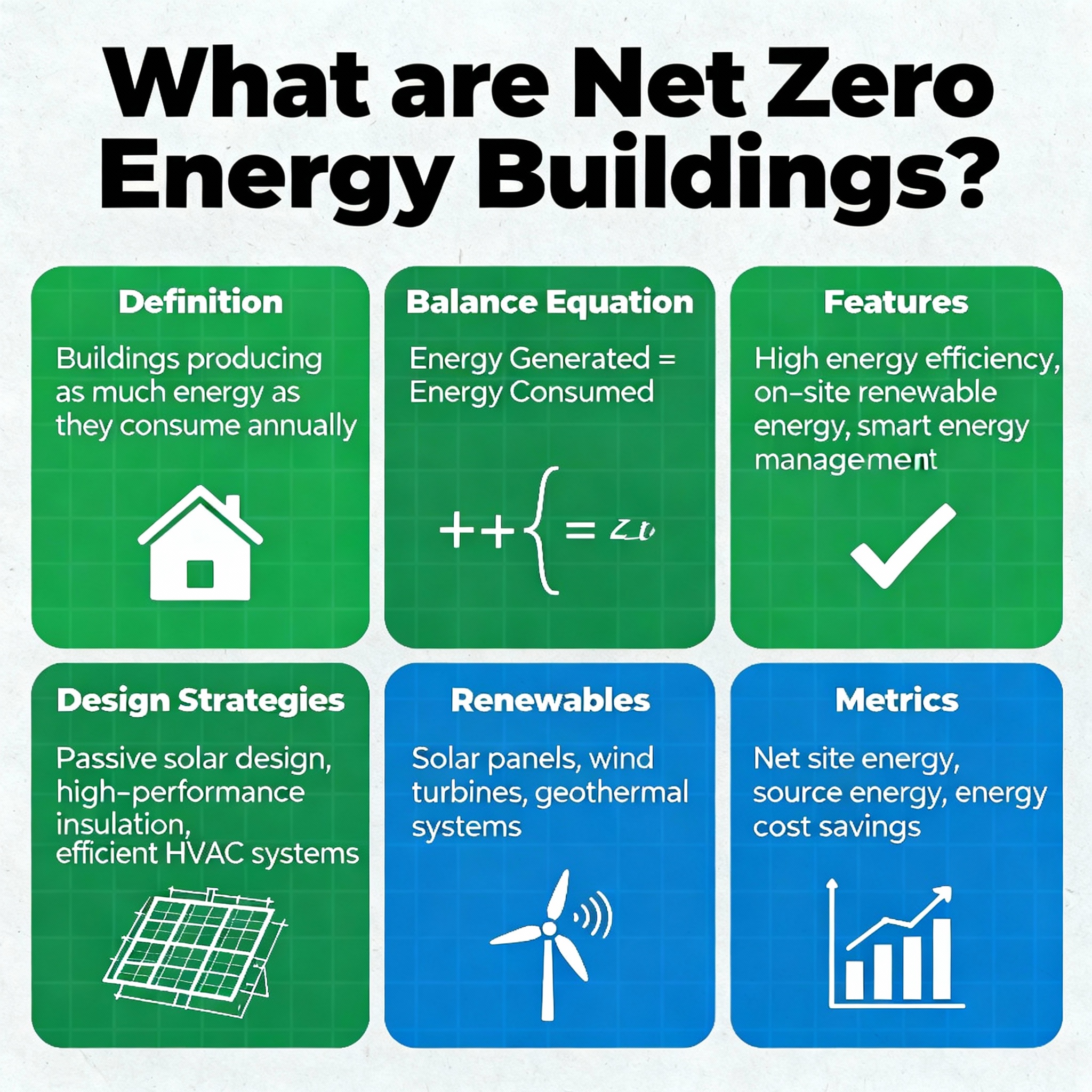 A Net Zero Building is a structure designed to balance total energy consumption with energy production over a year. This is achieved through: